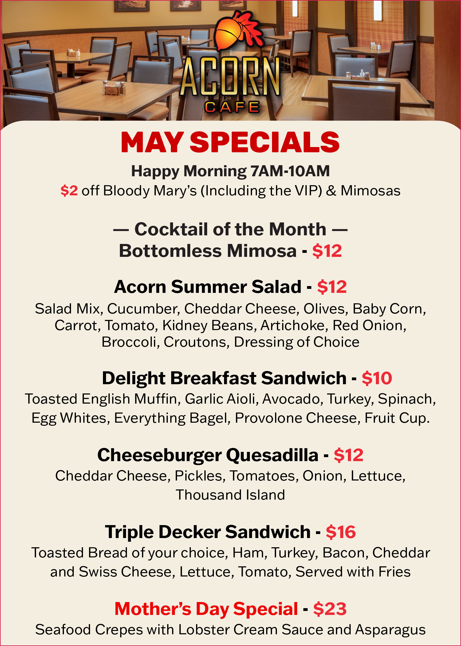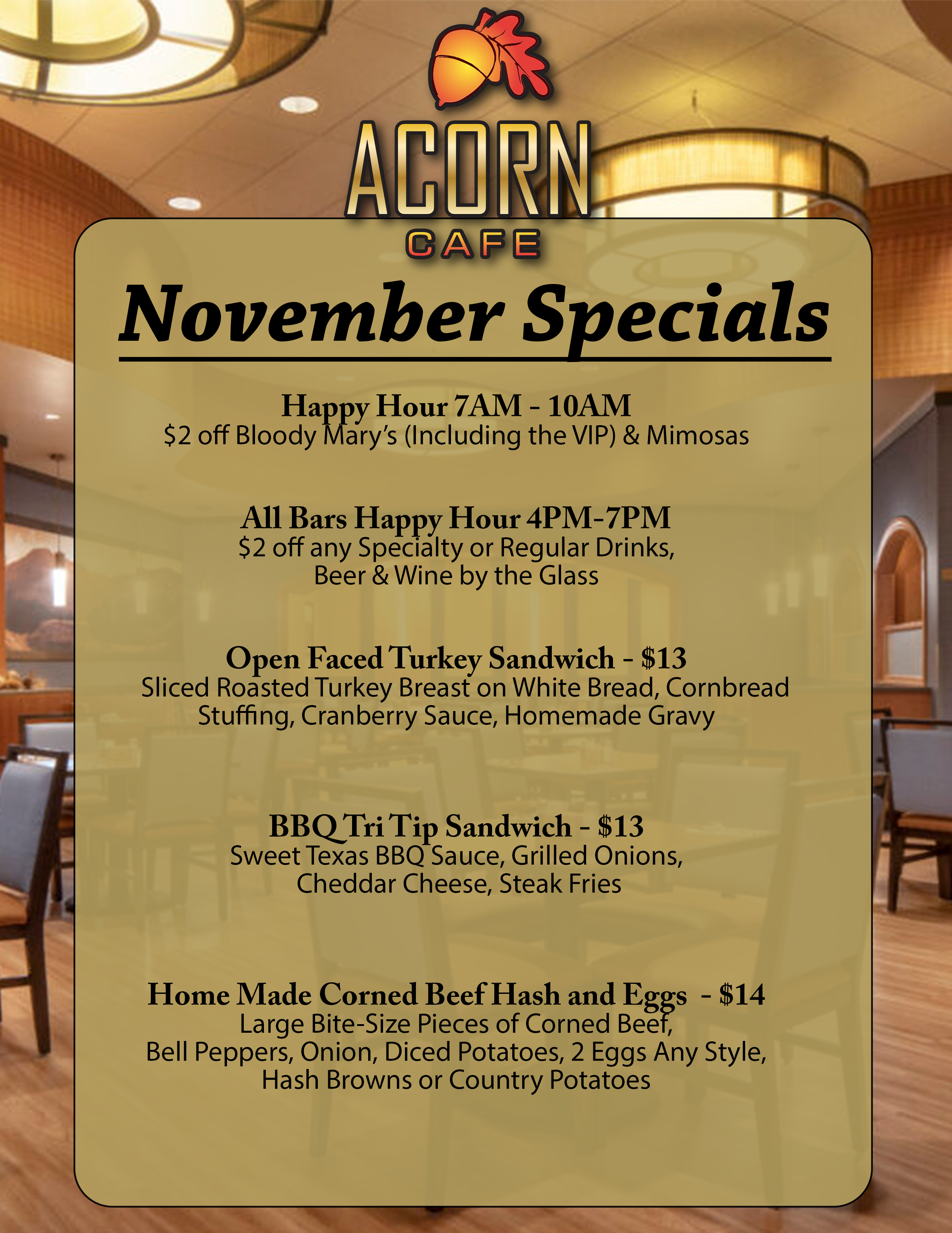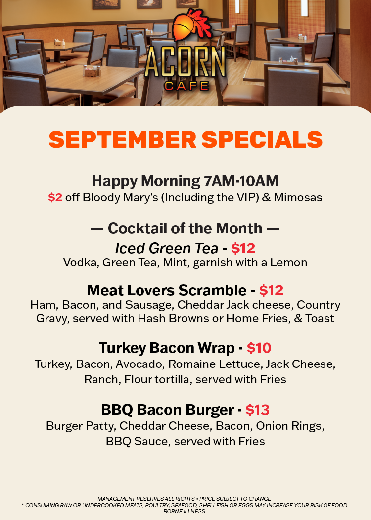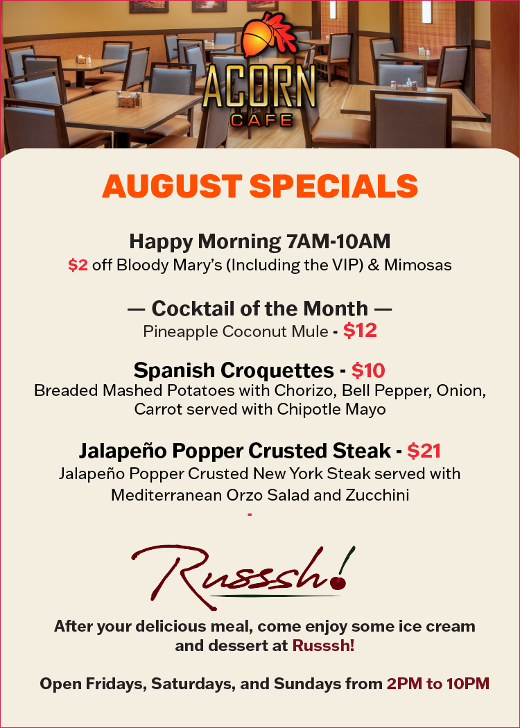 Welcome to the Acorn Café, where Storied Tradition meets Modern Comfort. We offer mouthwatering comfort classics and contemporary café delights – there is something for everyone to indulge their whims.