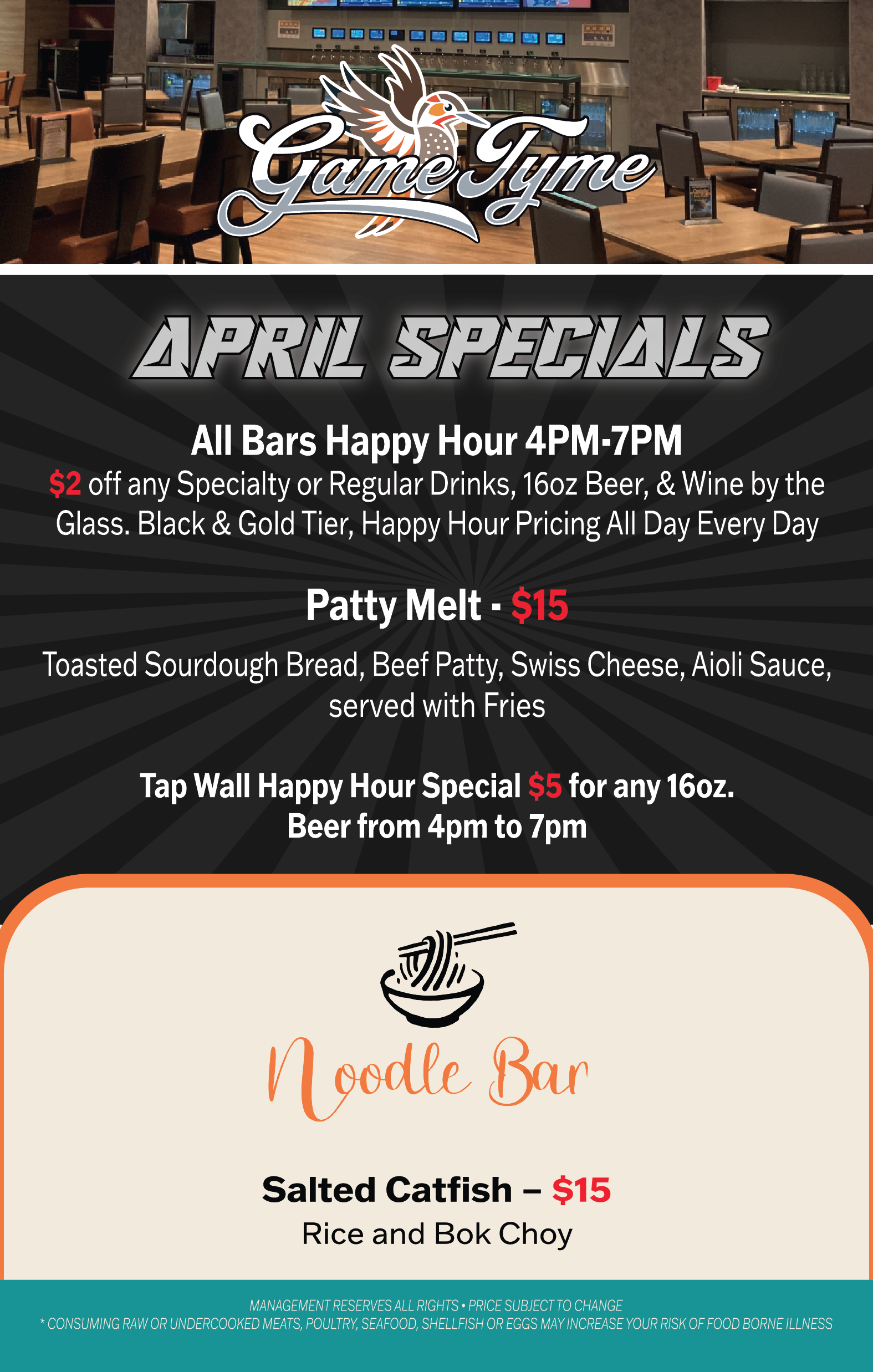 Welcome to the opening of our new restaurant at the GCCR! Head into Game Tyme and ask about our Noodle Bar and enjoy our variety of Asian food such as the Udon Noodles, Wonton Soup, Pho, and much more!