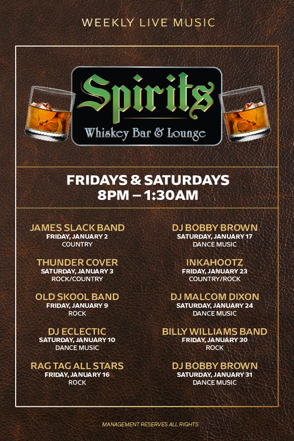 Enjoy a variety of entertainment, all from the same seat! Let our knowledgeable, fun bar staff help you choose that perfect drink. Don’t forget to ask about our specialty: delicious Whiskey creations. We offer a verity of over 50 different Whiskeys to choose from. Cheer for the home team on multiple wide-screen TVs. Enjoy FREE first-class live entertainment every Thursday, Friday, and Saturday and dance the night away! “There’s always something great happening in the Spirits Whiskey Bar & Lounge.”