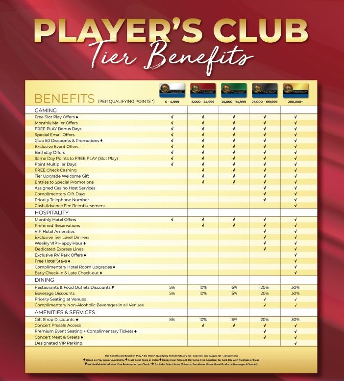 Sign up to begin earning points on your play immediately! Points can be downloaded as free play, spent on an amazing meal at one of our award winning restaurants, or towards a nights stay at our luxurious hotel. Must be at least 21 years of age and have a valid government-issued photo ID for membership. Please visit the player's club for more details.